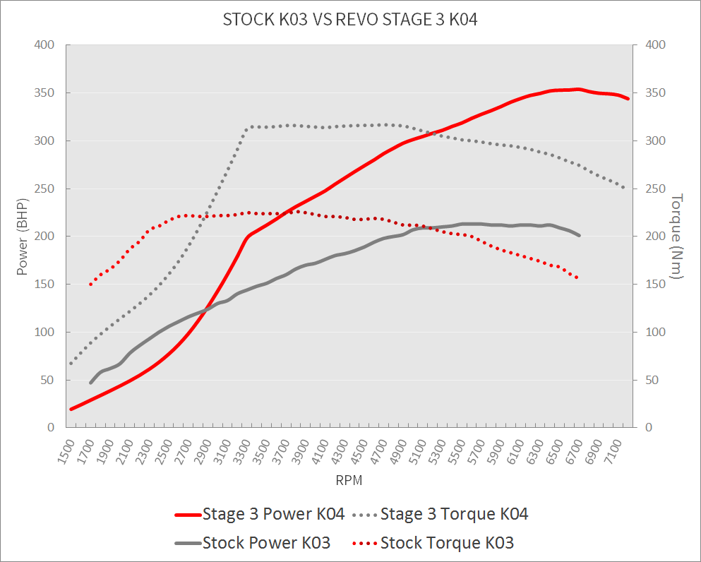 Portanto, usando o turbo K04 de fábrica e os injetores correspondentes do motor de especificação mais alta, juntamente com algumas outras modificações padrão, o software de desempenho Revo Stage3 K04 no motor 2.0L TFSi baseado em K03 é uma ótima maneira de atualizar seu motor para bem mais de 300bhp.